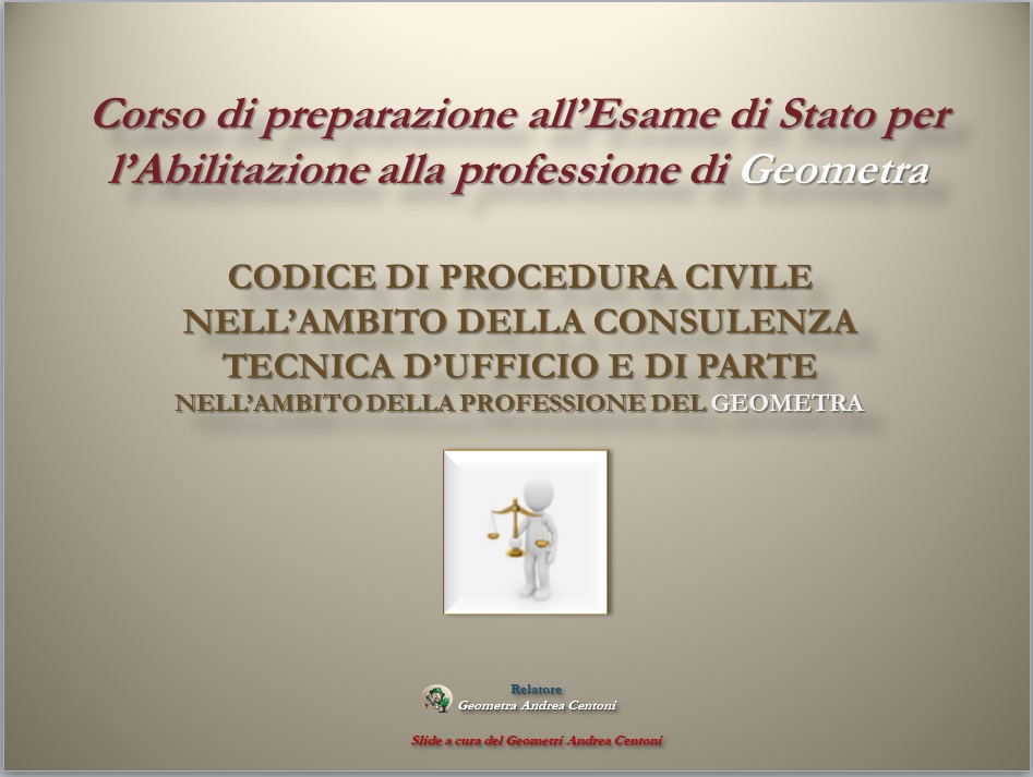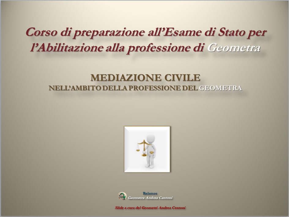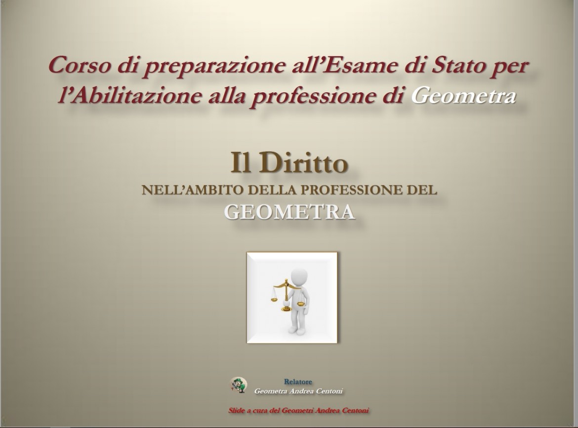 Vuoi avere le Slides del Corso Abilitando relativo a quest'anno? Contattaci e Ti invieremo le slides del Corso di Diritto e di Mediazione, a cura del Geometra Andrea Centoni